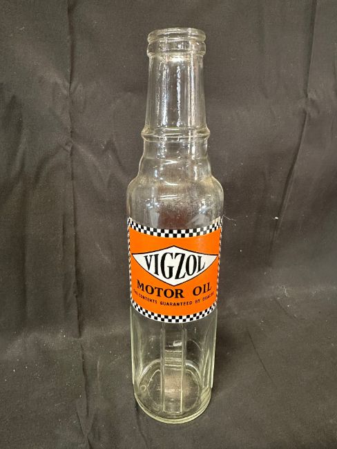 A Vigzol Motor Oil glass pint-sized oil bottle.