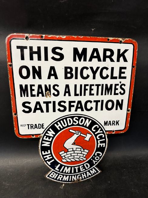 A New Hudson Cycle Co.y Limited of Birmingham enamel advertising sign - This mark on a bicycle means a lifetime's satisfaction, by Patent Enamel Co. Ltd. B'Ham, 16 1/4 x 21 3/4".