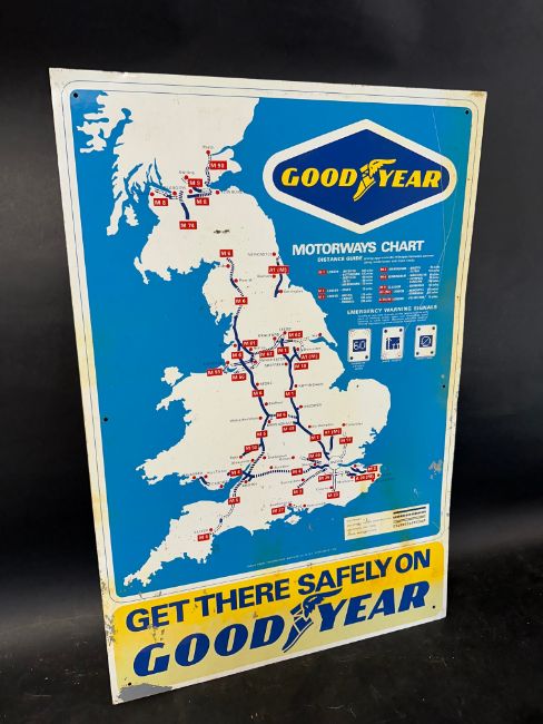An early 1970s Goodyear tyres Motorways Chart giving approx mileage between centres using motorways and main roads, aluminium, 20 x 30".
