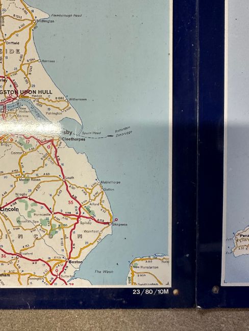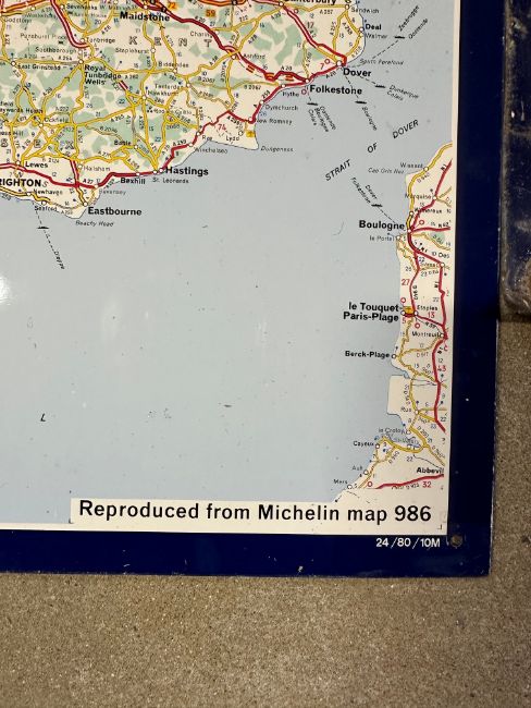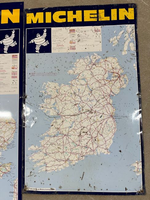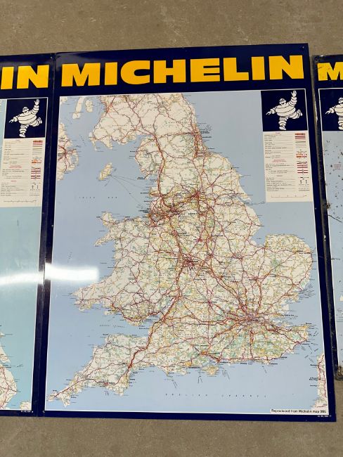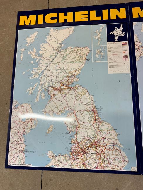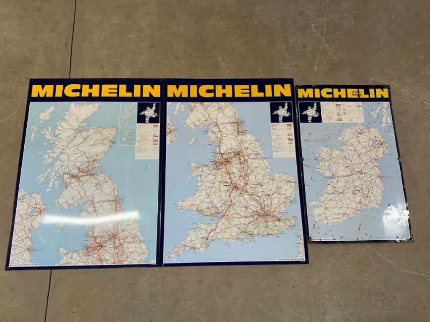 A good set of three 1980 Michelin tyres aluminium road maps spanning the UK roads, each reproduced from Michelin map 986 and dated to bottom right, Scotland - 25 x 34 1/4", England and Wales - 24 3/4 x 34", Ireland 18 1/2 x 29".
